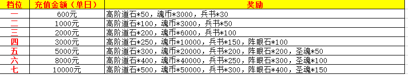 2、在活动期间内,以玩家每日累计充值的最大金额领取其对应的档位奖励。只可选择其中一档领取。