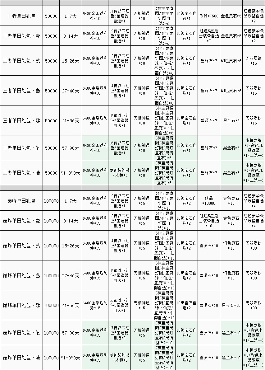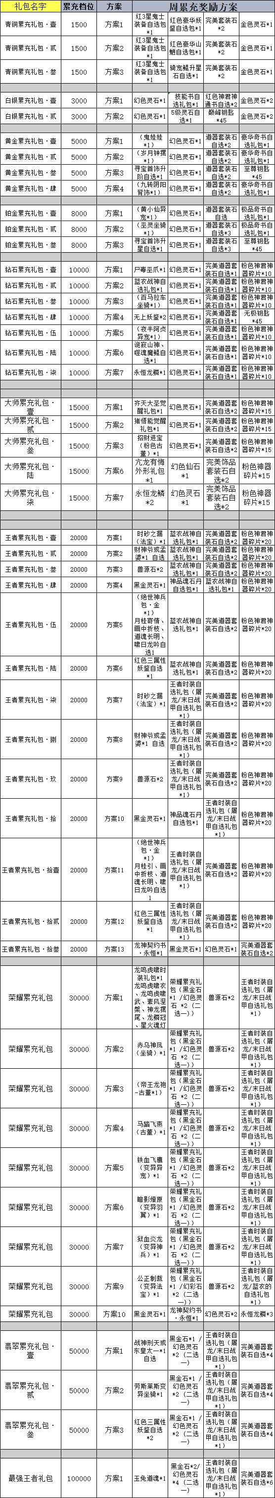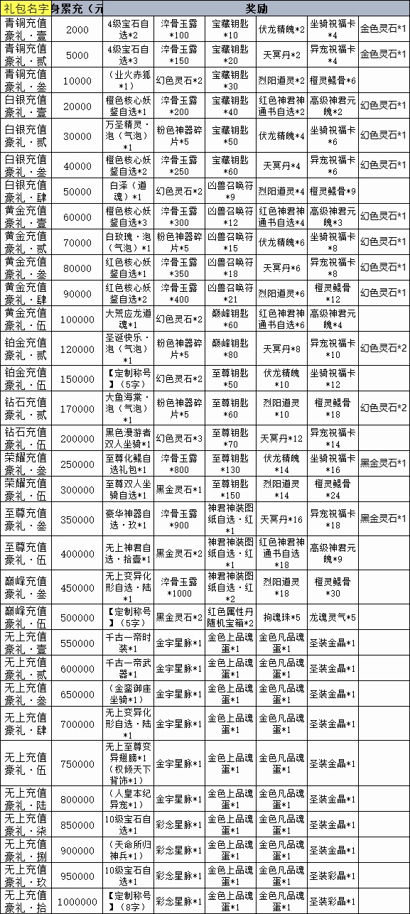 2、玩家充值累计达到指定金额,可获得该档位达到的最高档的奖励,可选择任意一个符合要求的奖励方案发放