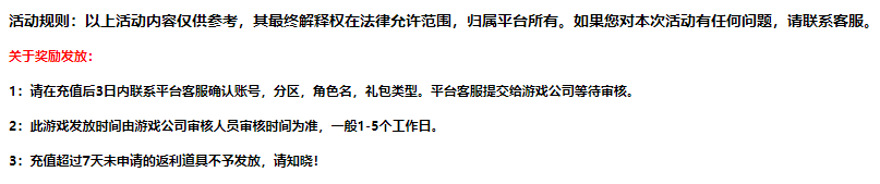 活动内容:日常线下单笔充值礼包双倍(满足条件请联系平台在线客服申请)