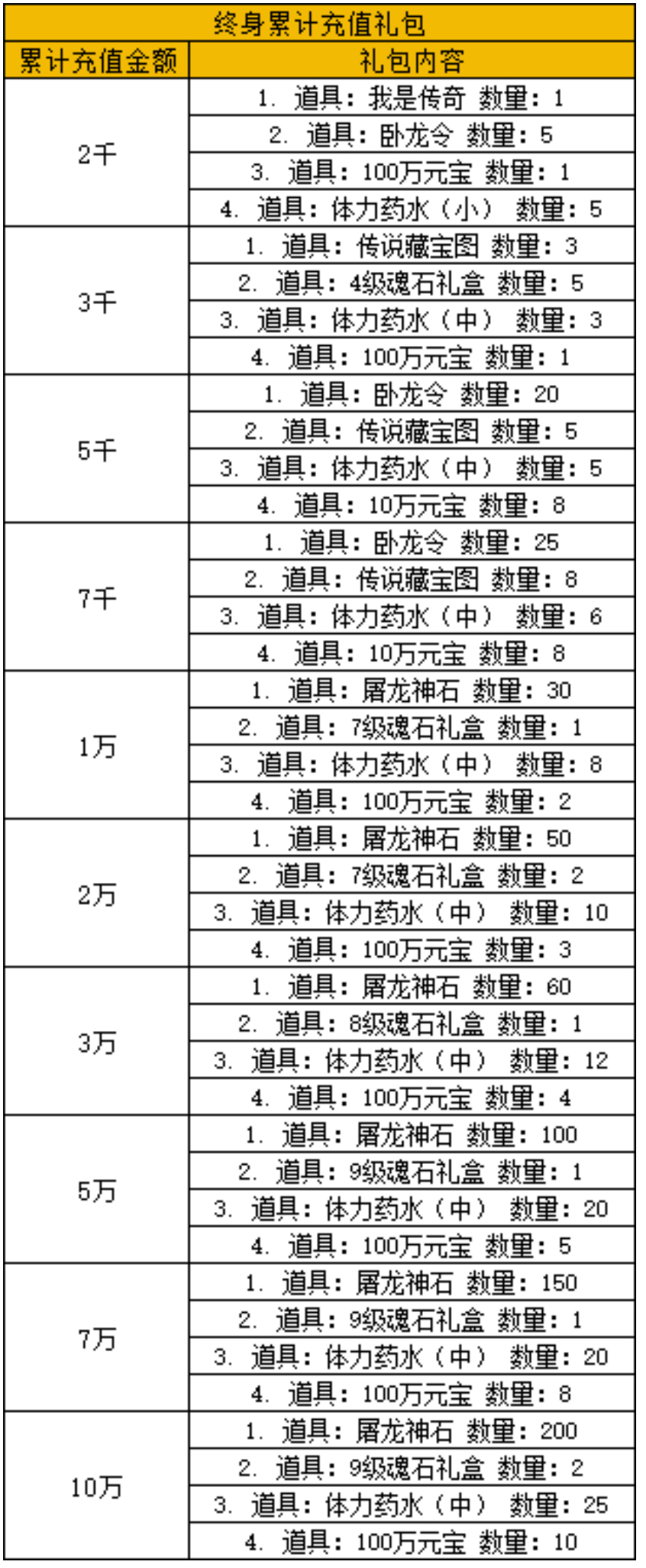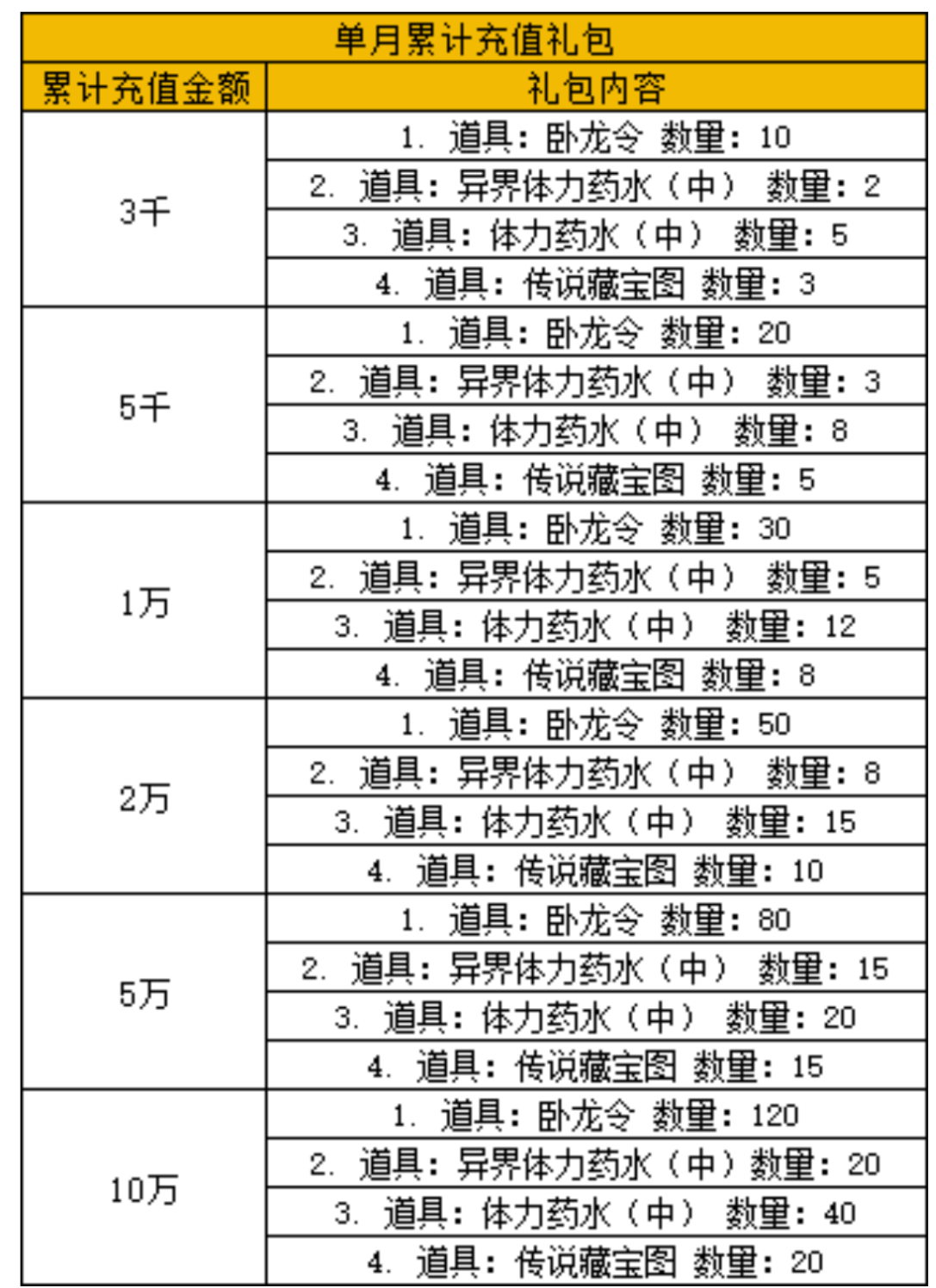 2、达到档位可领取对应累充向下档位的所有礼包【累充额度每月1号0点清零!】