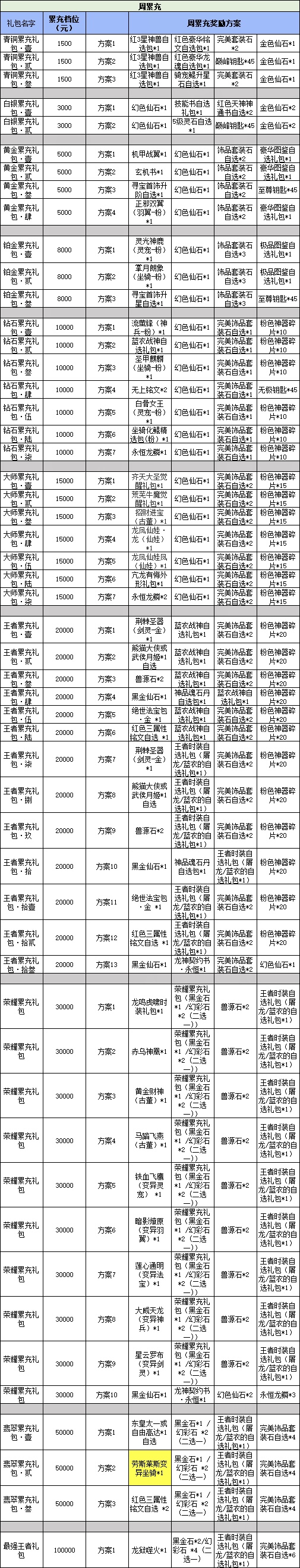 2、玩家充值累计达到指定金额,可获得该档位达到的最高档的奖励,可选择任意一个符合要求的奖励方案发放“例如充值1500元可以选择1500档位三个方案中的任意一个”;