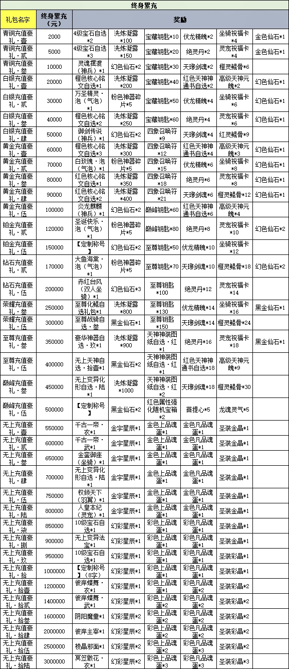 1、用户累计充值金额达到以上金额,即可获得对应金额礼包(每个礼包只能领取一次)