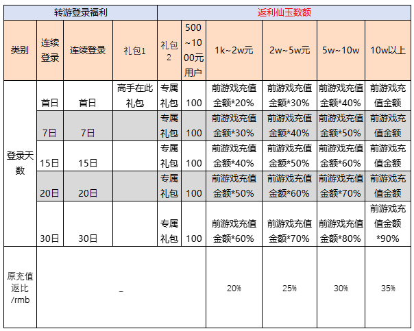 1、面向受邀转游用户,在新服创建角色后返还其原账号下历史累计充值,返利金额最高上限为100000rmb,但需要符合对应的条件;