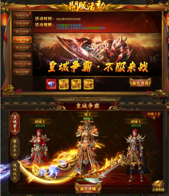 活动内容:开服第四天开启皇城争霸 占领皇城行会额外获得20000钻石奖励