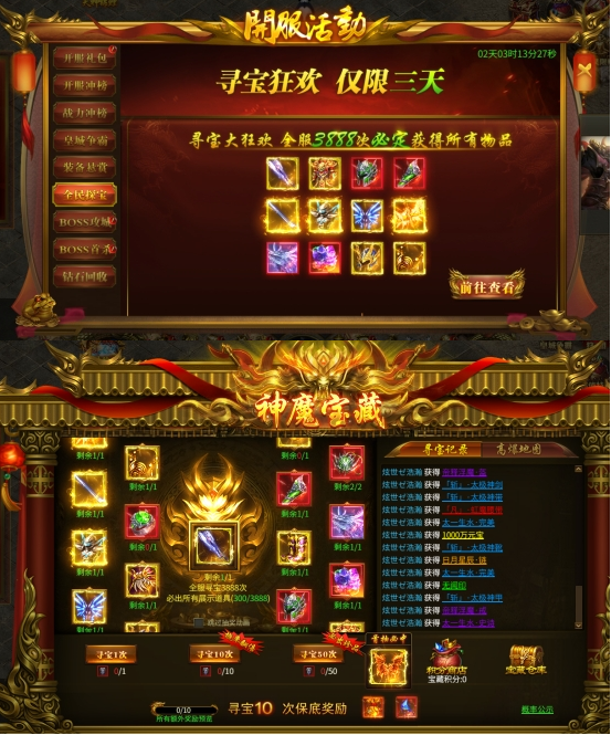 活动内容:开服第三天开启,每次寻宝都奖励,寻宝10次可获得保底奖励。