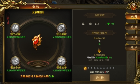 3、需要收集对应的圣物碎片进行升级,可以提升人物属性,四种圣物属性分别为生命、攻