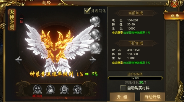 2、消耗羽毛升级翅膀可以提升属性,同时提升神装幸运爆率提升