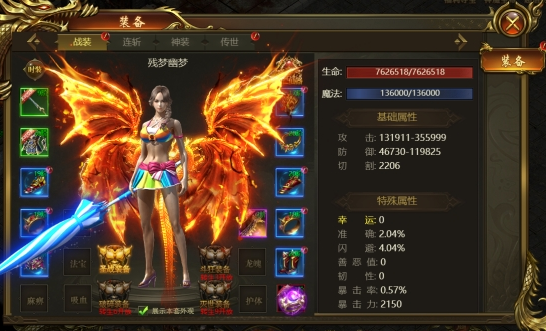 4、连斩可以激活四种技能,激活各项属性功能。神装穿戴套装装备后可以激活套装属性,属性得到大幅度的提升。
