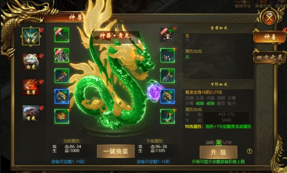 消耗指定道具可以对神兽进行升级可以提高属性,同时也可以穿戴装备。