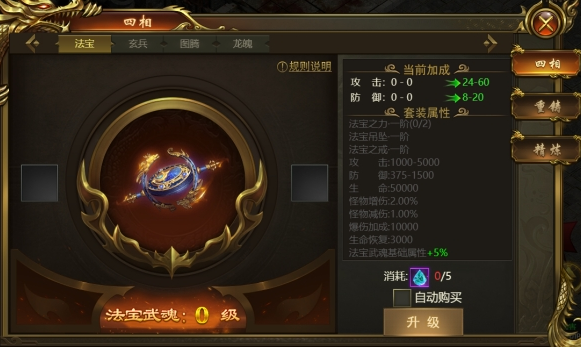 2、分别消耗法宝精华/玄兵精华/图腾精华/龙魄精华对四相进行升级,升级可以提升属性。