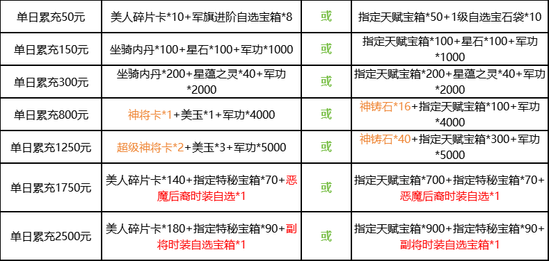 【活动规则】活动期间单日累计充值或五日累计充值达到对应条件,即可向客服申请奖励;两个板块互不冲突,可叠加