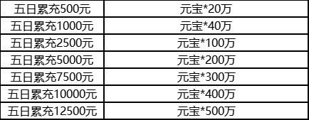 说明:① 五日累充金额满足以下条件可额外获得元宝返利。各档位返利元宝不能累加领取,只能获得最高那个档位的元宝