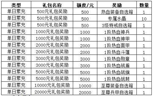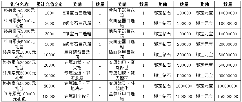1.玩家创角后开始计算累计充值金额,当累充金额达到对应档次,可申请相应礼包(只计算游戏中真实充值,游戏内充值卡不算)