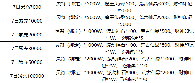 活动期间,累计充值达到指定档位,即可领取对应礼包。每个档位限制领取一次,例如:玩家充值2W,可以领取2W档位及2W之前全部档位奖励