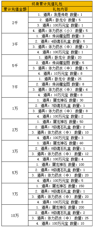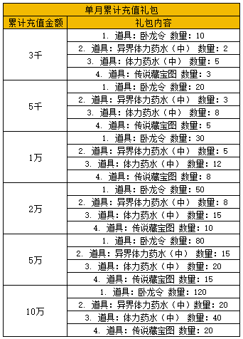 2、达到档位可领取对应累充向下档位的所有礼包【累充额度每月1号0点清零!】