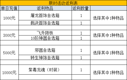 活动说明:活动为限时内单日累计,隔天申请,单日累计取最高档位,比如玩家单日累计5000元,只能选择5000档位道具。