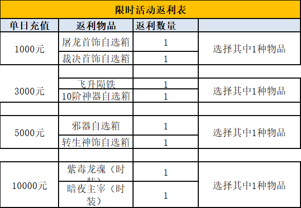 活动说明:活动为限时内单日累计,隔天申请,单日累计取最高档位,比如玩家单日累计5000元,只能选择5000档位道具。
