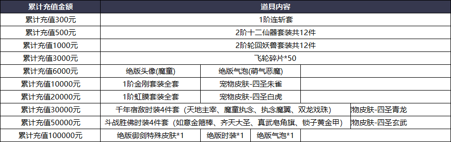 活动说明:单个角色单个区服累计充值达成