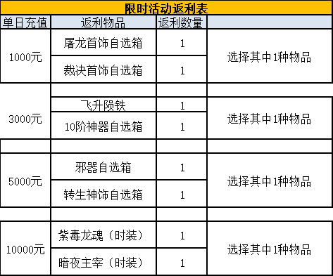 活动说明:活动为限时内单日累计,隔天申请,单日累计取最高档位,比如玩家单日累计5000元,只能选择5000档位道具。