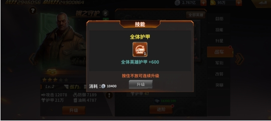 前面升战力,有两个捷径,一个是不断的获得英雄,军力等级升高,从而战力提升。第二个就是升战车,尤其是增加全体属性的战车技能等,其中全体护甲是升战力最多的。
