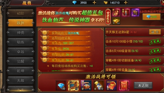 战将系统是游戏前期让玩家熟悉游戏且收益丰厚的系统,所有奖励免费领取。战将系统最重要的功能就是远程回收装备,解锁第二阶战将--跃升战将之后,玩家将不会再因为背包爆满而频繁的往来于主城和野外,游戏体验有极大的提升,请务必解锁该功能。