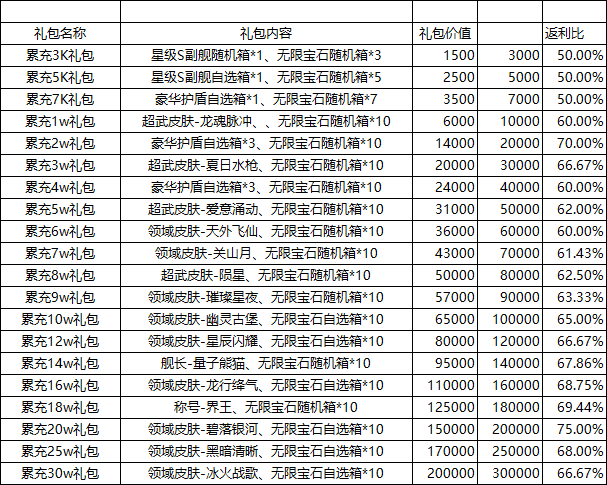 活动内容:玩家终生累充达到指定额度,可获得该金额对应档位的奖励,返利档位终生只能领取一次